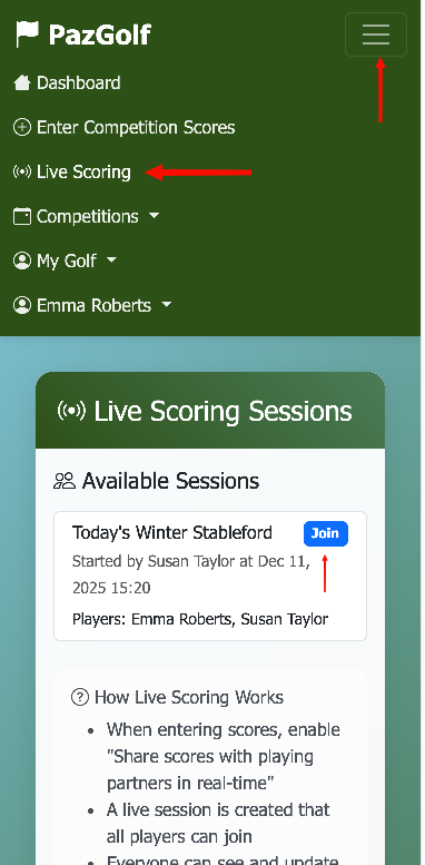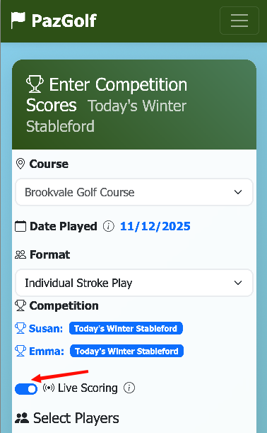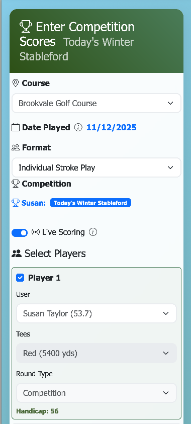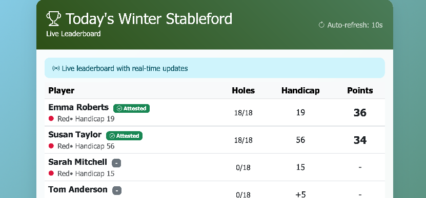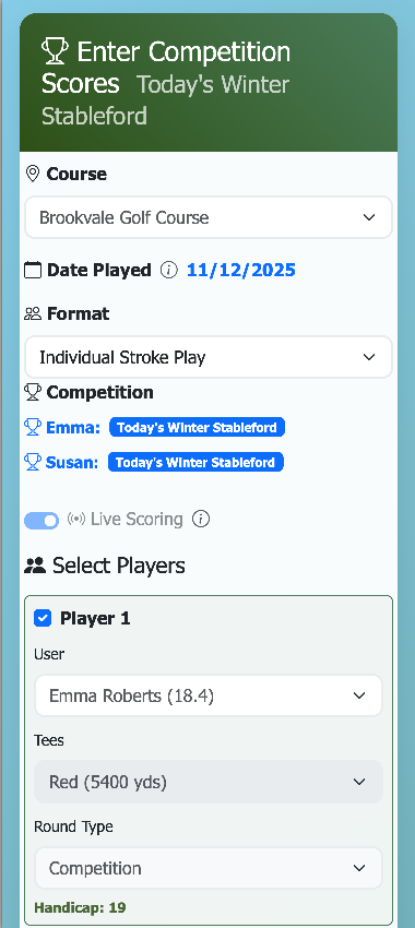 Emma can see both their scores appearing in real-time as Susan enters them. If Susan's battery dies mid-round, Emma can even continue entering scores from her phone - the session stays active.