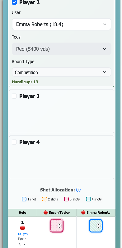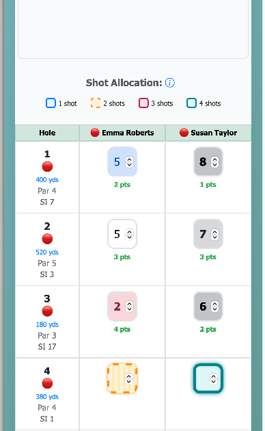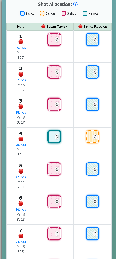 Notice the coloured highlighting on some holes? This shows where each player receives (or gives) handicap strokes.