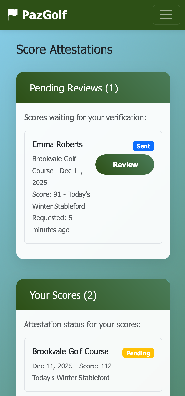 With PazGolf, the digital equivalent works like this: one player enters the scores during the round, both players verify before submission, and then each player attests the other's score afterwards. This digital attestation replaces the physical signature - it confirms "yes, I was there and these scores are correct."