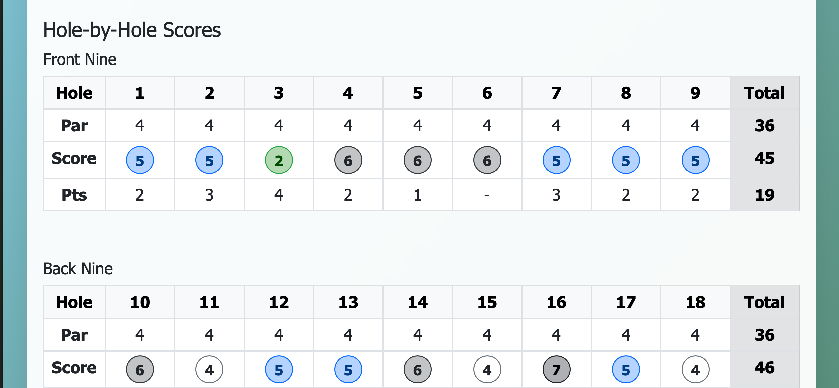 She can see Emma's hole-by-hole scores, gross total, and Stableford points.