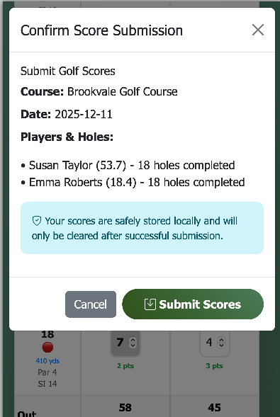 She checks the details are correct and taps Submit Scores. The scores are safely stored locally and will only be cleared after successful submission.