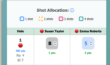 As soon as she enters each score, PazGolf instantly calculates the Stableford points. Susan shot 8 on the par 4 - with her 3 shots on this hole, that's a net bogey for 1 point. Emma shot 5 - with her 1 shot, that's a net par for 2 points.
