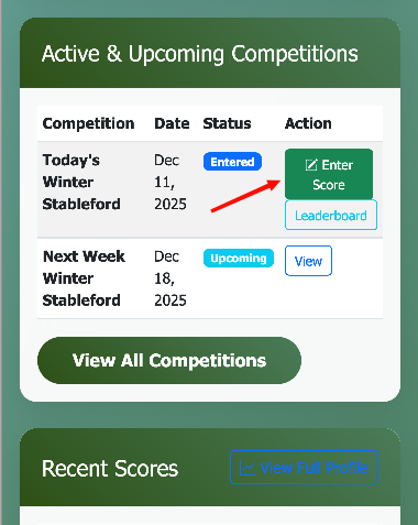 From her Dashboard, Susan taps Enter Score on the competition card.