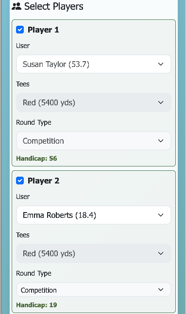 PazGolf fully supports groups where players are on different tees. If James was playing with Susan and Emma, he might be on the Yellow tees while they're on the Red tees. No problem - each player's handicap is calculated for their own tee set.